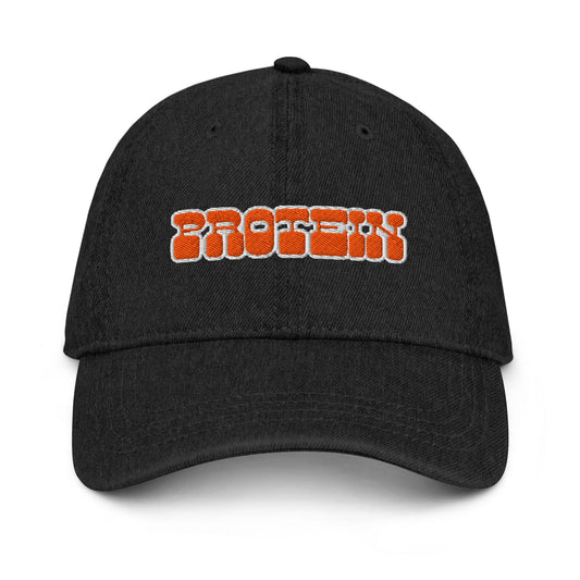 Protein Denim Hat – Groovy Bubble Letter Embroidered Cap in Light, Blue, or Black Denim