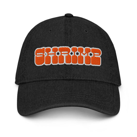 Shrimp Denim Hat – Groovy Bubble Letter Embroidered Cap in Light, Dark, or Black Denim