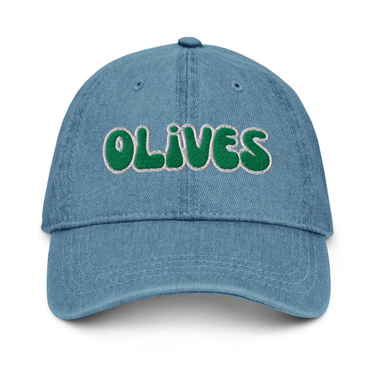 Olives Denim Hat – Groovy Bubble Font Embroidered Cap in Light, Blue, or Black Denim
