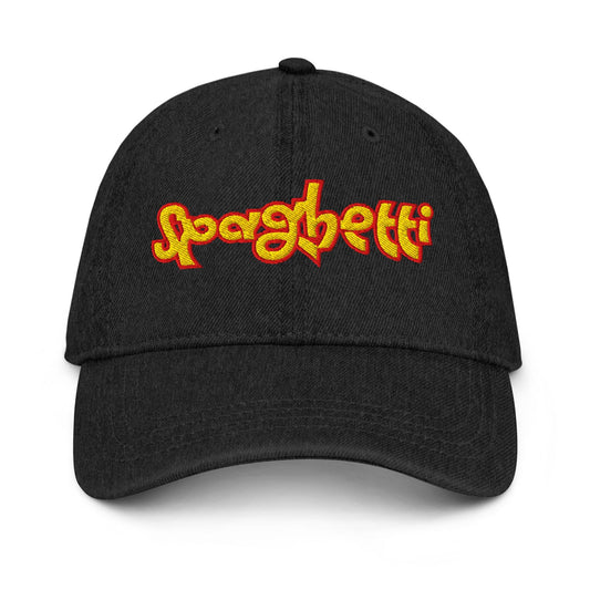 Spaghetti Denim Hat – Groovy Embroidered Bubble Font Otto Cap in Light, Blue, or Black Denim