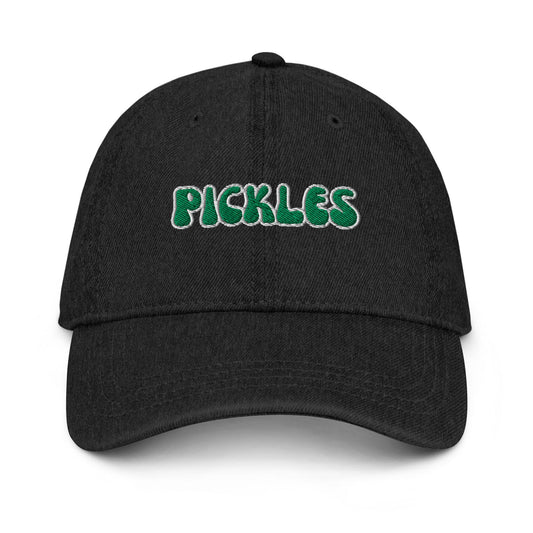 Pickles Denim Hat – Groovy Bubble Font Embroidered Otto Cap in Light, Blue, or Black Denim